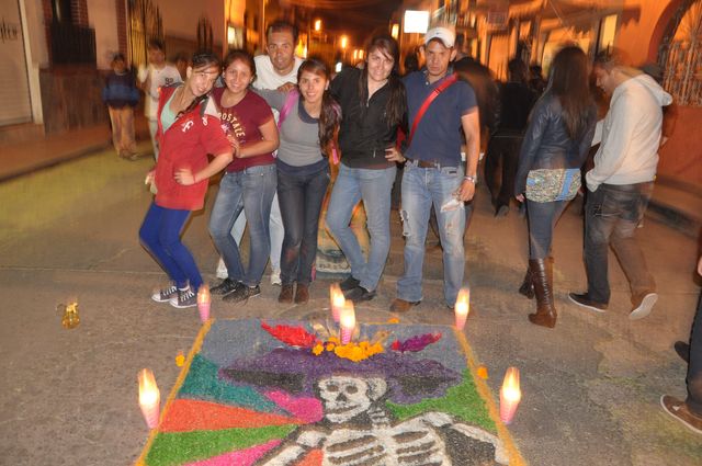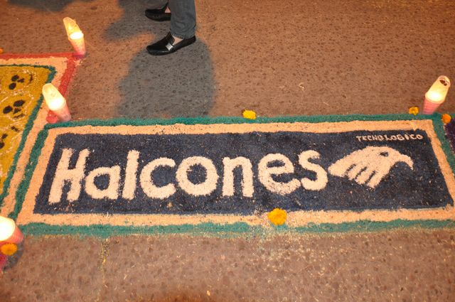 Jiquilpan, Mich. 1 de noviembre de 2012. El H. Ayuntamiento de Jiquilpan coordinó la tradicional noche de Día de muertos. Para esta ocasión estudiantes del Tecnológico participaron en la elaboración de complicados tapetes coloridos los cuales primero se trazan con cal en un par de líneas paralelas en el centro de las calles principales, para dar forma a un pasillo de aproximadamente 60 cm de ancho que servirá de marco a la creatividad de los participantes. El aserrín es la materia prima para la realización de estas singulares alfombras; en su estado natural es usado como un colchón en donde se plasmará una gran variedad de motivos cuyos diseños surgen de la imaginación de cada participante en el momento de su creación o mediante el empleo de moldes con dibujos previamente seleccionados, los cuales, intercalados entre sí, delinean cada figura. Mediante colorantes como la anilina, el aserrín es sometido a un proceso de teñido, y así se obtienen diversas tonalidades para rellenar cada porción del diseño hasta el ras del molde. Estas imágenes representan la creatividad de los jóvenes participantes del Instituto que en esta ocasión no utilizaron plantilla alguna, es decir todo fue realizado a mano alzada. COMUNICACIÓN Y DIFUSIÓN.